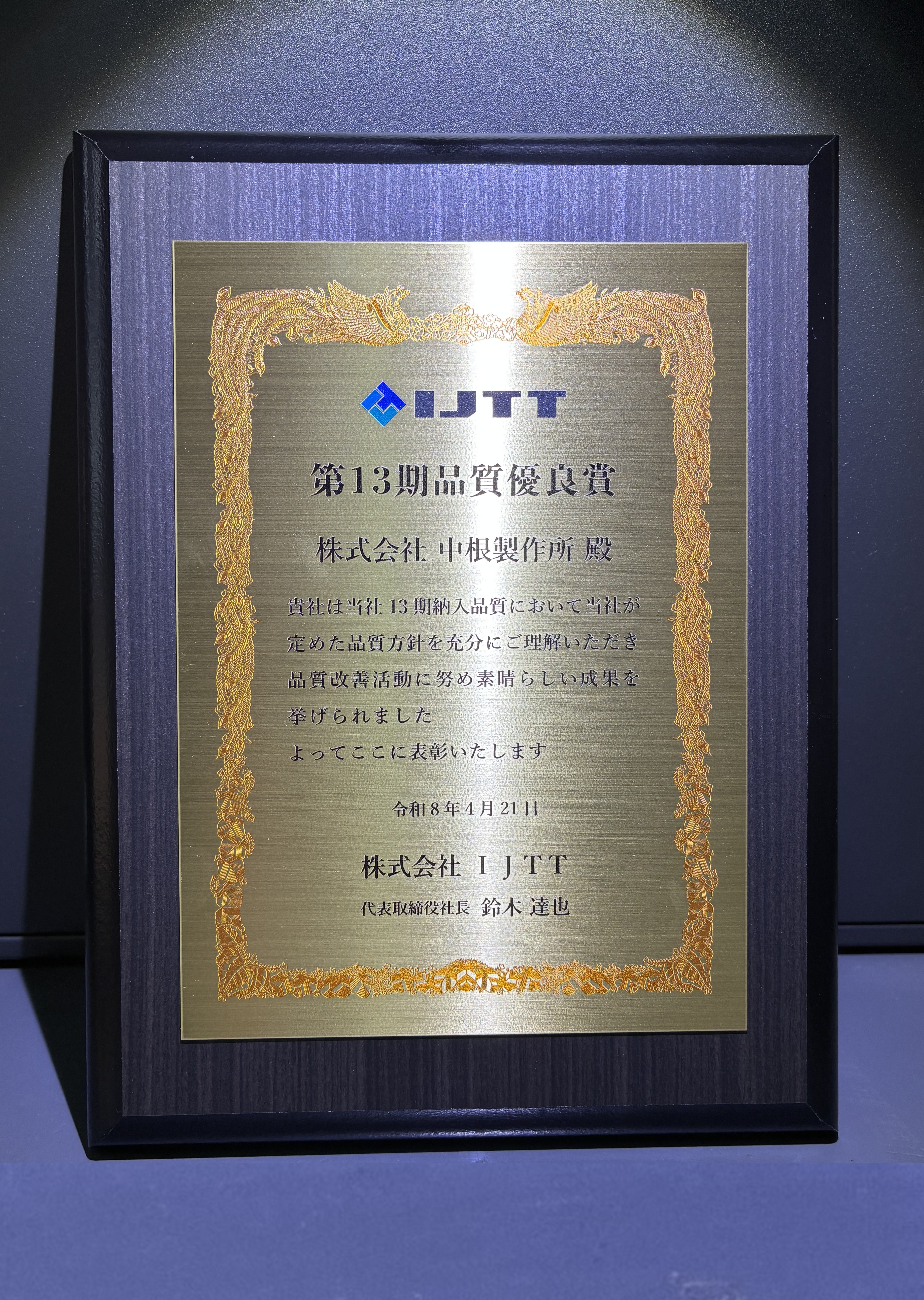 2025年度『品質優良賞』とは、株式会社IJTT様が約200社のお取引先の中から品質や納入、コスト改善、環境対応などにおいて模範となる仕入先10社を選出され、表彰して頂ける名誉ある賞の一つです。